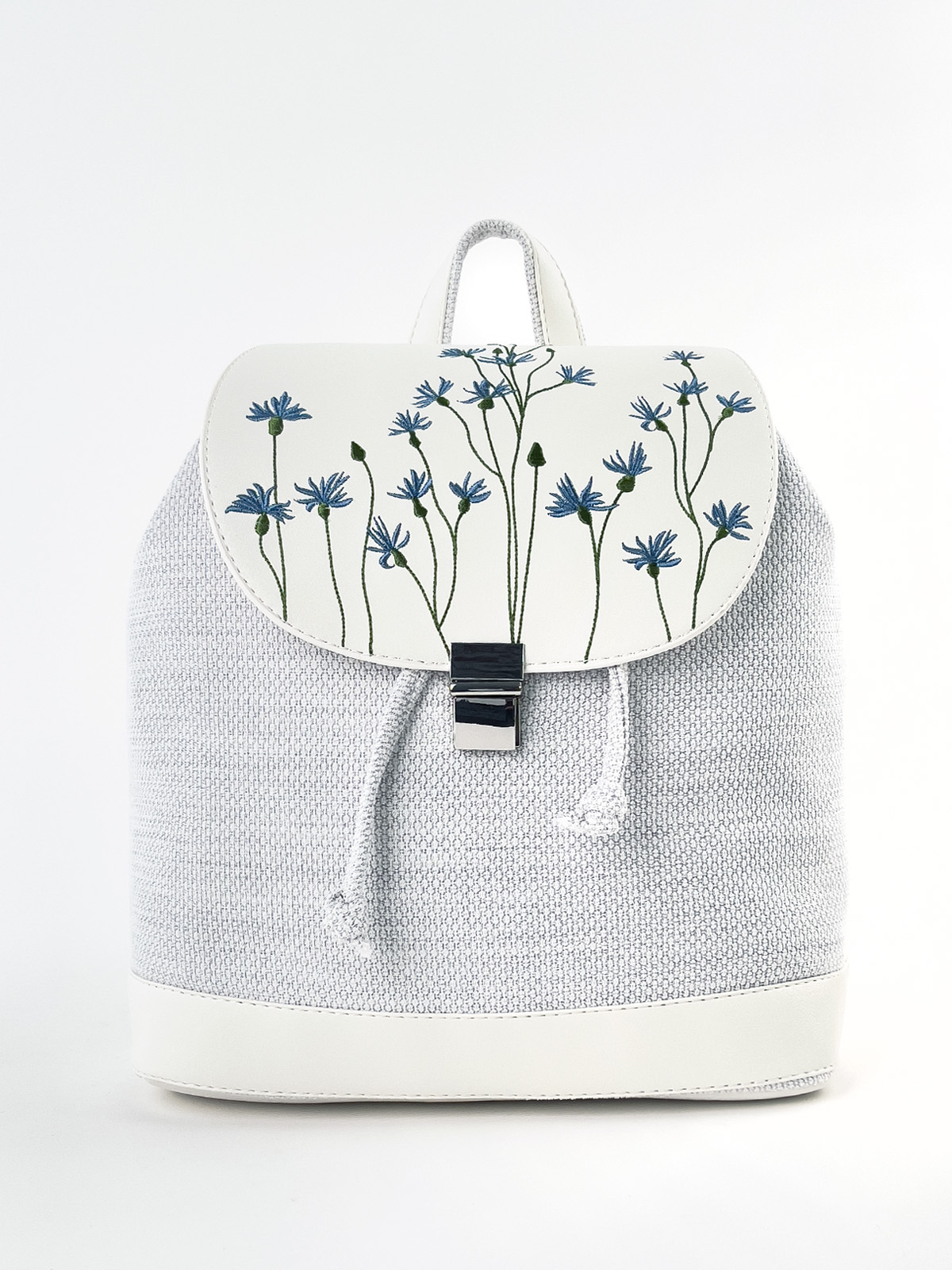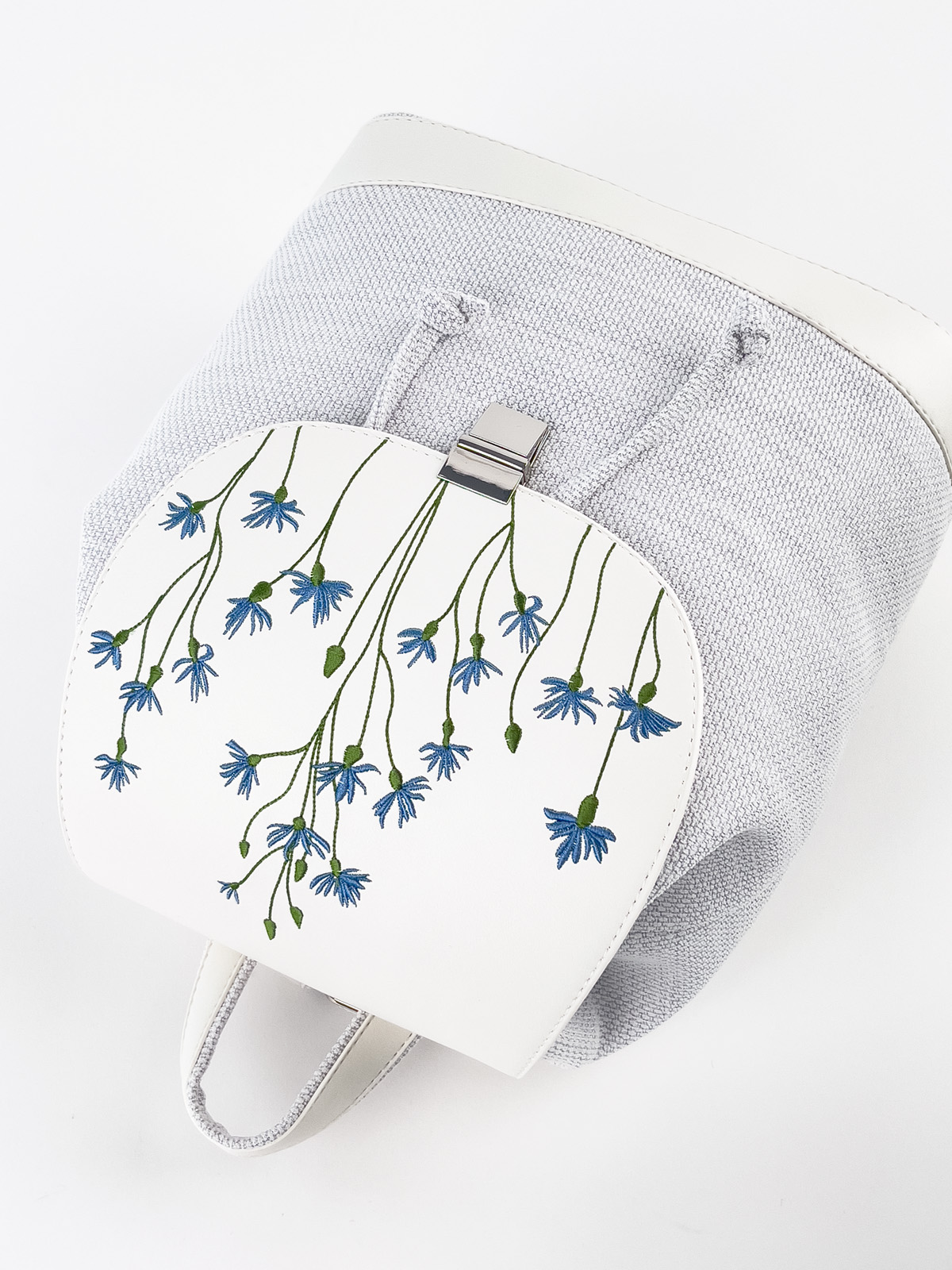 Невеликий прогулянковий рюкзак. В середині одне відділення та дві кишені: на блискавці для дрібних речей та кишеня для телефону. Рюкзак застібається на кулісу та клапаном зверху на портфельну застібку. Зовні на задній стінці розташована кишеня на блискавці. Плечові ремені регулюються, максимальна довжина 90 см. Клапан рюкзака оздоблений вишивкою.