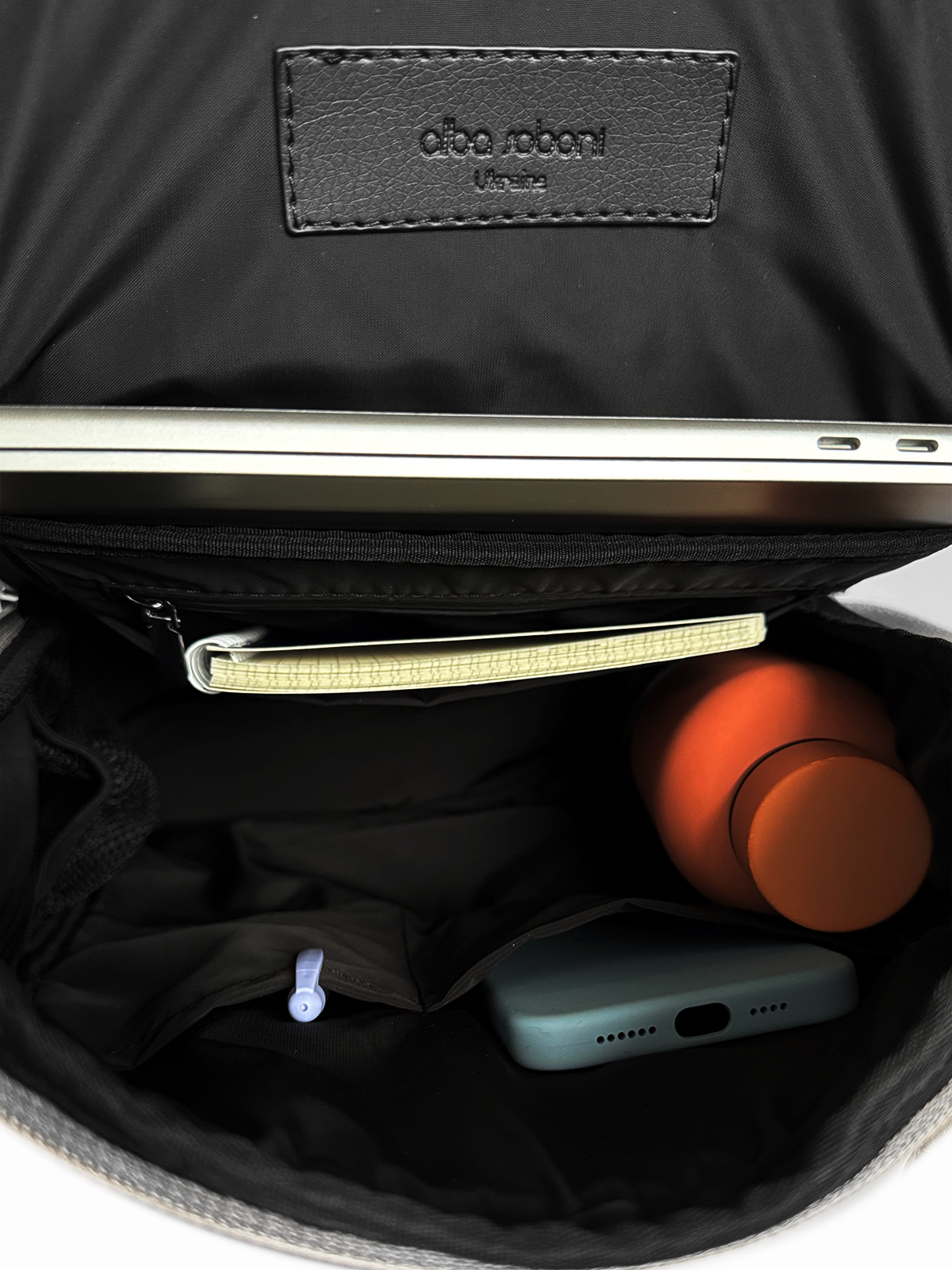 Рюкзак з відділенням для ноутбука розміром до 13.6. В середині рюкзак має багато кишень: на блискавці для документів, обємний карман для нотатника або зарядного пристрою, всередині дві бокові кишені для пляшки води чи термосу, на передній стінці рюкзак має дві кишені для телефону та повербанку. Відділення для ноутбуку розташоване на задній стінці рюкзака має ущільнені стінки, які захищають ноутбук від механічного пошкодження, розмір кишені для ноутбуку складає 33х22х2.5 см.