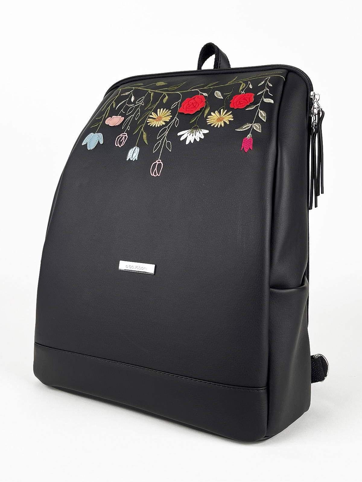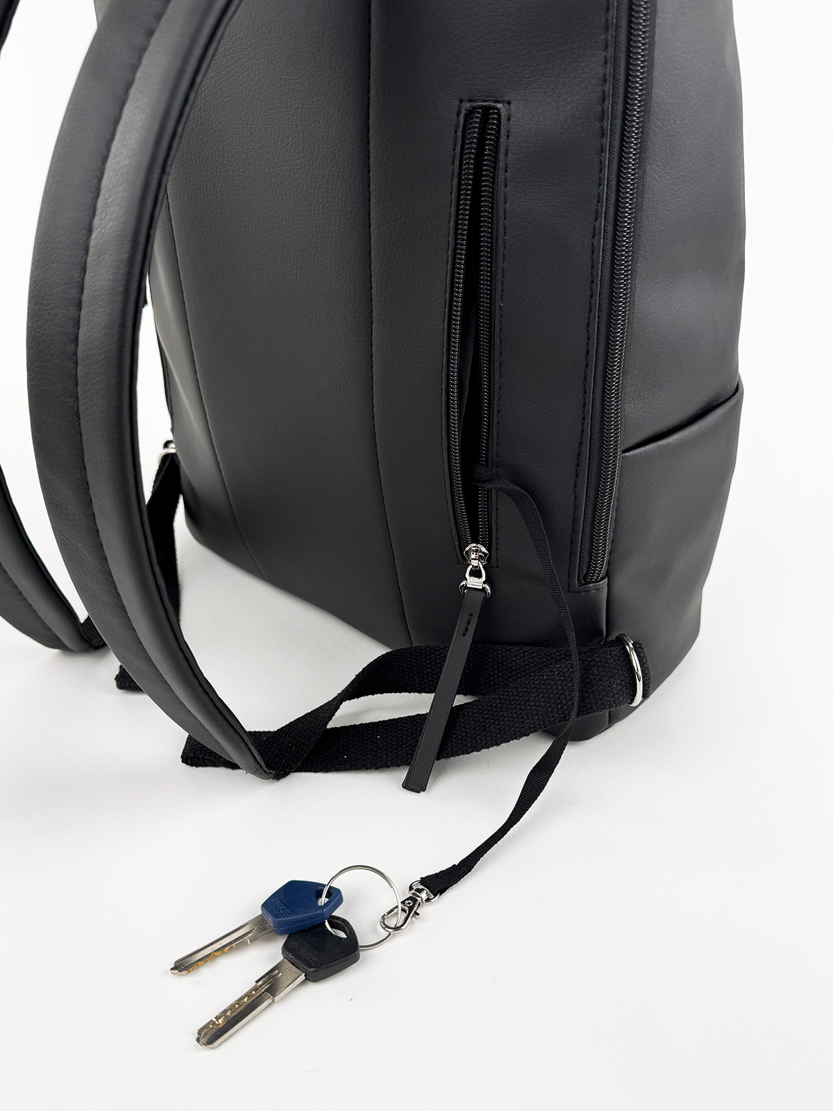 Зовні рюкзак має дві бокові кишені на магнітах, на задній стінці кишеня на блискавці для дрібних речей та вшита тасьма з карабіном для ключів.