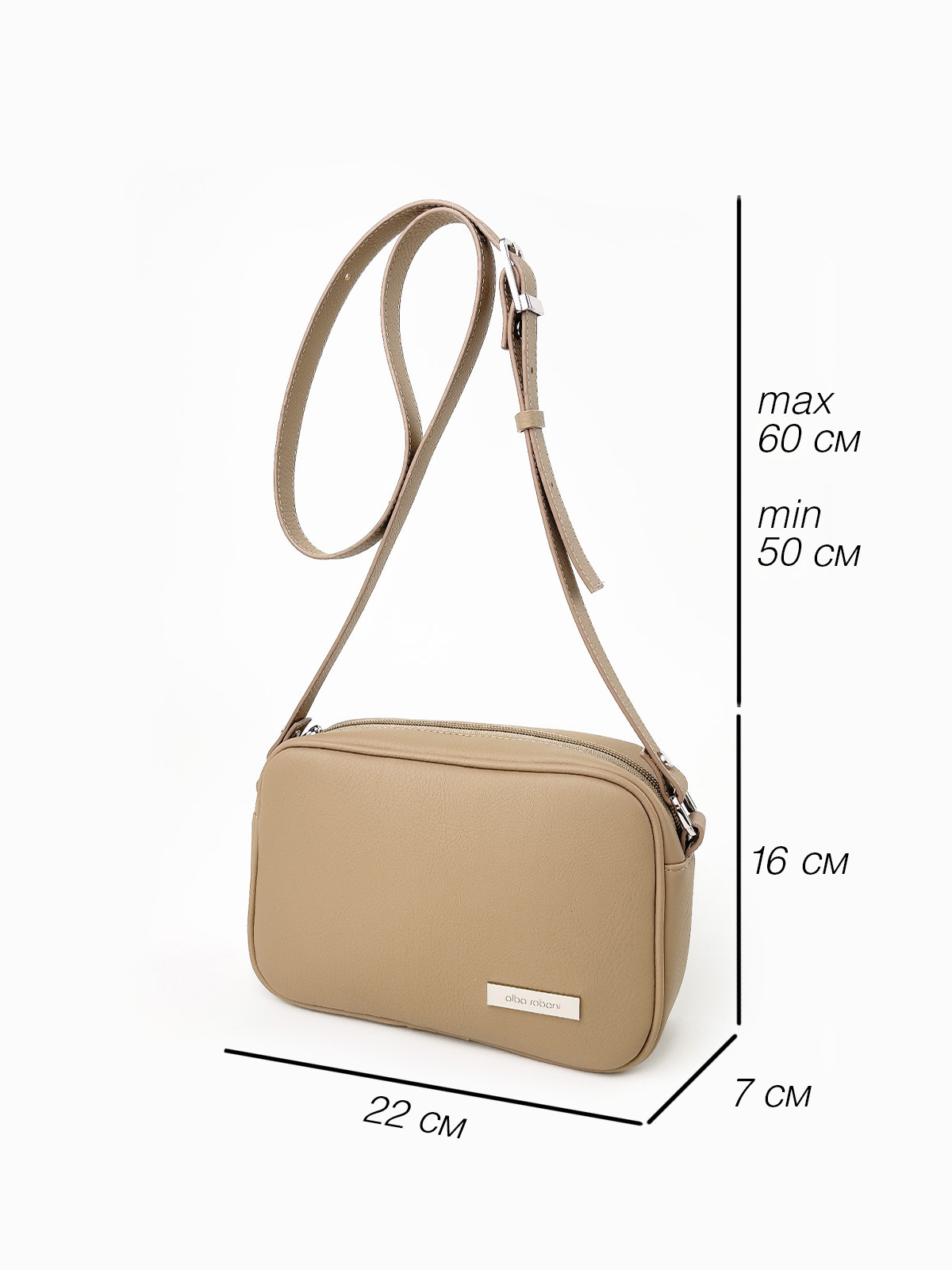 Сумочка крос-боді має одне основне відділення та дві внутрішні кишені, одна з яких на блискавці - для зручного зберігання дрібниць. Додаткова кишеня на блискавці розташована на задній стінці. Регульований плечовий ремінь (110135 см) дозволяє носити сумку максимально комфортно.
