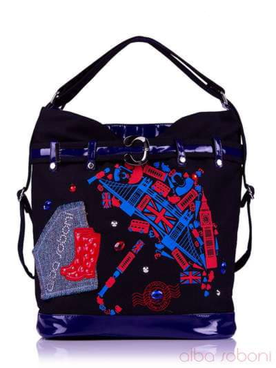 Молодіжна текстильна сумка - рюкзак. Дві регульовані ручки дозволяють носити сумку як через плече, так і використовувати її у вигляді рюкзака. Сумка виготовлена з міцного льону, оброблена штучною шкірою, прикрашена каменями, стразами, вишивкою, шовкотрафаретного печаткою. У сумці одне відділення на блискавці, всередині три кишені: кишеня на блискавці, під моб. телефон, для документів.