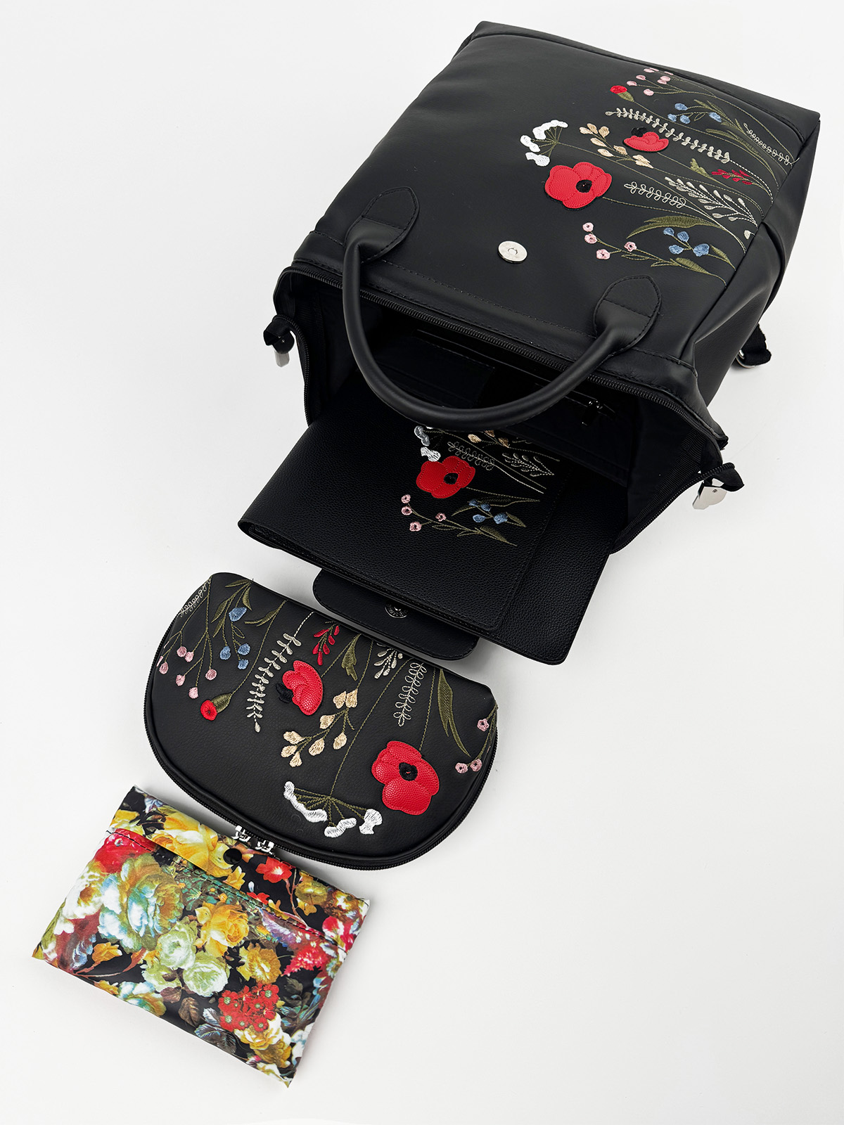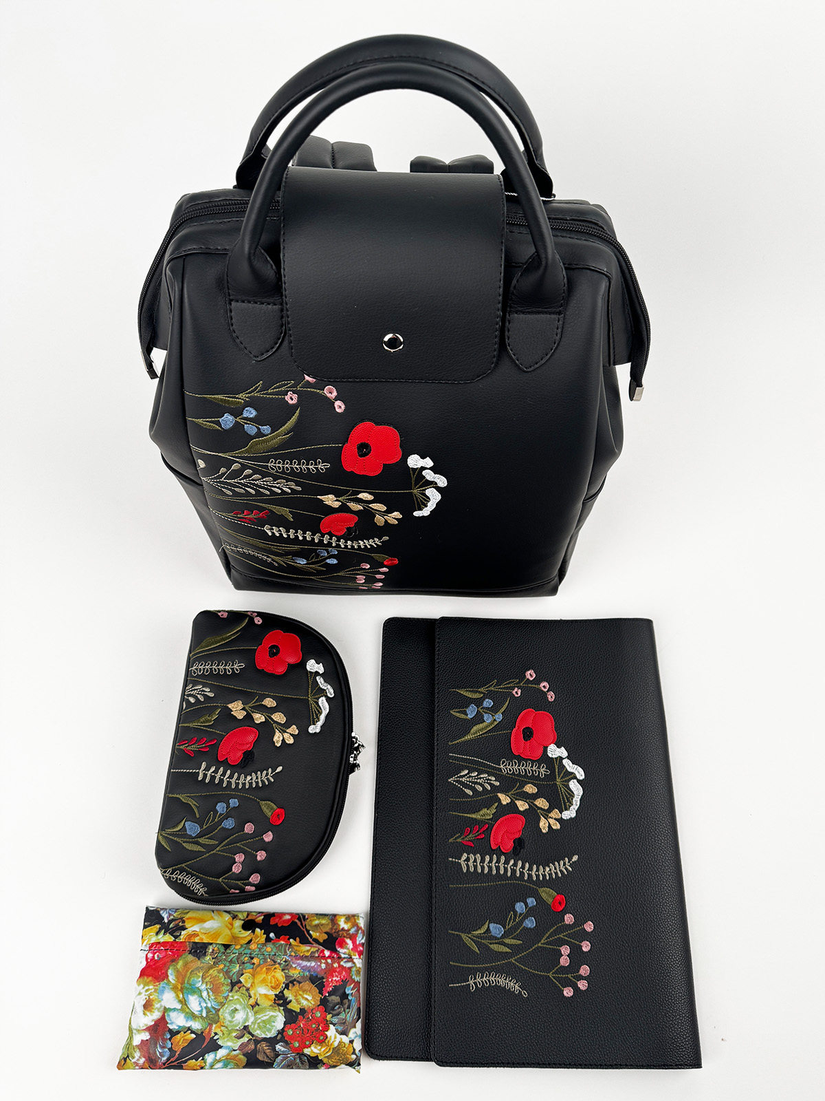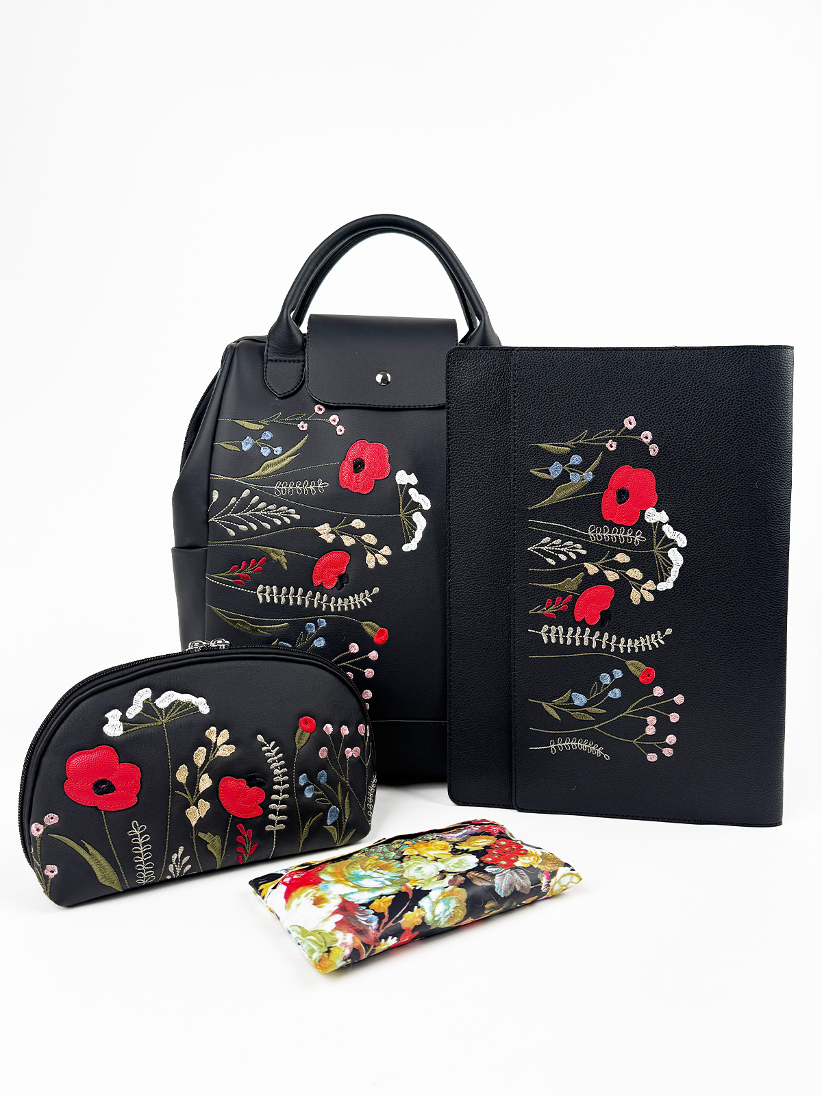 Комплект складається з трьох аксесуарів: рюкзака, шопера, косметички та чохла для ноутбука.