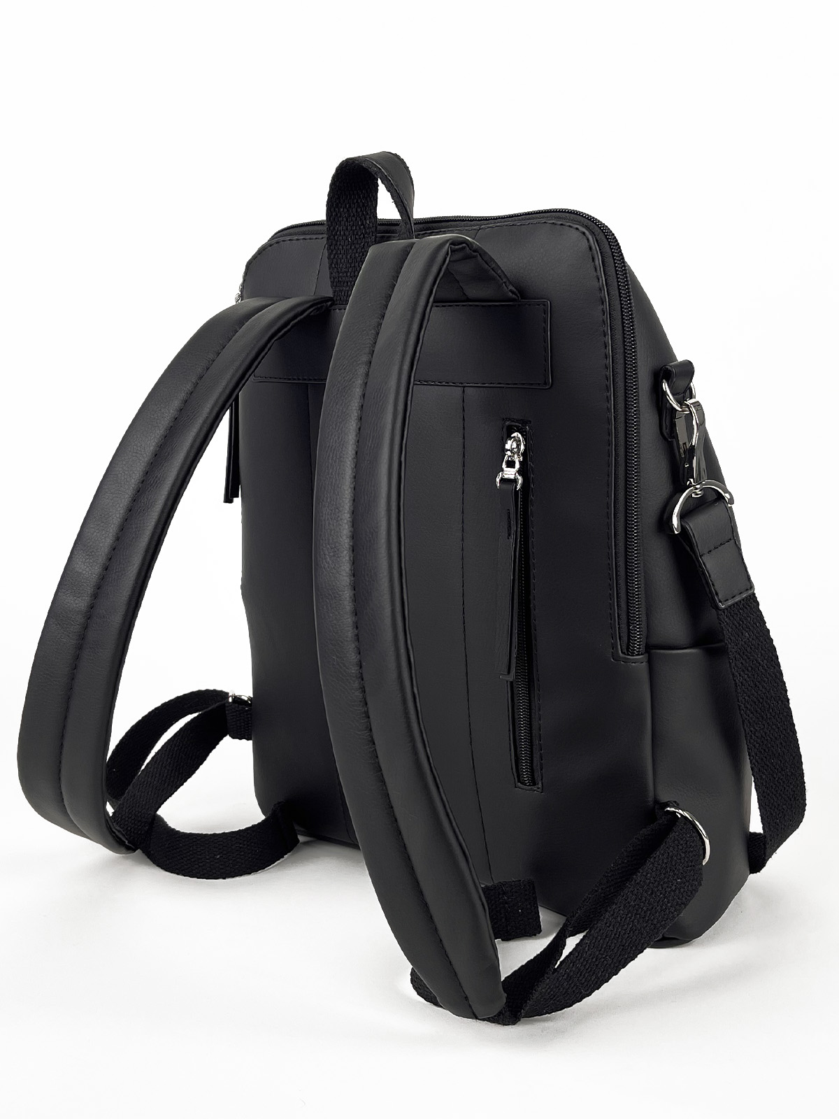 Зовні рюкзак має дві бокові кишені на магнітах, на задній стінці кишеня на блискавці для дрібних речей та вшита тасьма з карабіном для ключів.